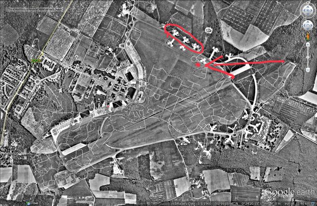 In the next picture, notice the small concrete patch just beside the wheel of Lisa’s car. The airfield blast walls would have been arranged beside the perimeter road. Is that patch of concrete a last remnant of the blast walls? I like to think so….
