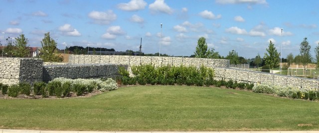 You can see the top of the North Downs behind the roundabout. Where the sequence of blast walls once stood there is now a public garden, and an area awaiting development (as of 2021). Perhaps we can see a faint visual echo of the lost walls on the roundabout, which is topped by a blocky installation of broken stone, as seen below. I wondered if this installation might actually be an official commemoration of the walls, but Kent County Council told me they are actually meant to represent an aircraft propeller.